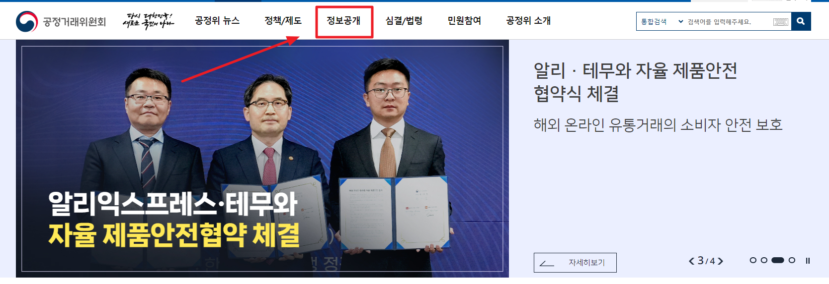 ② 홈페이지 상단 메뉴에서 '정보 공개' 섹션을 클릭합니다.