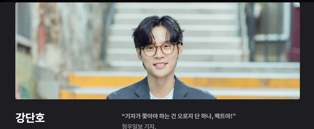 | 강단호 | 윤지온 | 팩트를 추구하는 사회부 기자 |