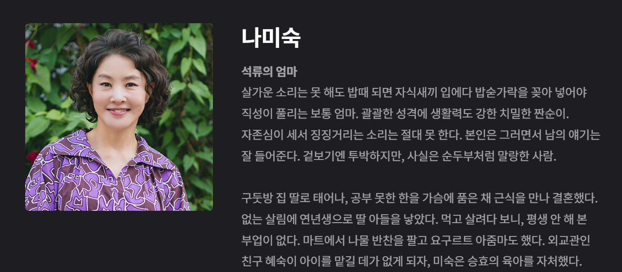 나미숙은 배석류의 어머니로, 강인한 생활력을 지닌 인물입니다. 겉으로는 투박하고 강인해 보이지만, 사실 그녀의 내면은 따뜻하고 부드러운 감정을 품고 있습니다. 그녀는 어려운 환경 속에서도 아이들을 키워내며, 강한 책임감을 가지고 가족을 돌봐왔습니다. 나미숙은 자신의 생활력과 강인함으로 주변 사람들에게도 많은 영향을 미치며, 특히 딸 석류와의 관계에서 그녀의 강인한 성격이 드러납니다. 그녀의 캐릭터는 드라마에서 가족을 지키기 위한 어머니의 헌신과 사랑을 상징하며, 시청자들에게 큰 감동을 선사합니다.