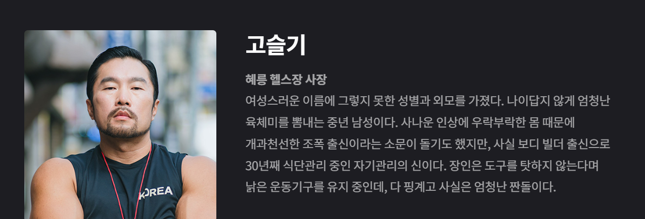 고슬기: 헬스장의 사장, 자기관리의 신