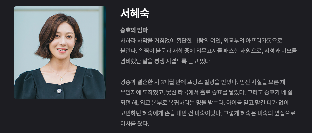 서혜숙은 최승효의 어머니로, 외교부에서 일하며 세계 곳곳을 누빈 외교관입니다. 그녀는 젊은 시절, 결혼 후 얼마 지나지 않아 프랑스에 발령을 받아 낯선 타국에서 아들을 홀로 낳았으며, 이후에도 계속 외국에서 근무하며 남편과 아들과는 멀어지게 됩니다. 일에 대한 열정으로 가득한 그녀는 자신의 커리어에 있어서는 성공적이었지만, 가족과의 관계에서는 거리를 두게 된 인물입니다. 오랜만에 한국으로 돌아와 가족과 재회하게 되면서, 그녀는 이전에 놓쳤던 가족의 의미와 관계 회복에 대해 고민하게 됩니다. 그녀의 캐릭터는 일과 가정 사이에서의 갈등과 그로 인한 내면의 변화를 깊이 있게 다룹니다.