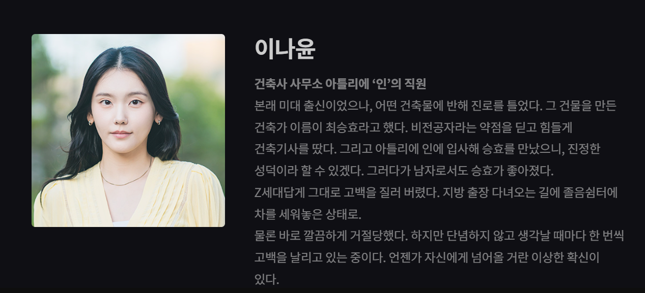 이나윤은 건축 사무소 아틀리에 '인'의 직원으로, 원래 미대 출신이었으나 최승효의 건축물에 반해 진로를 바꾼 인물입니다. 그녀는 승효를 동경하며, 그의 건축물뿐만 아니라 그 자체로서의 매력에 빠져들어, 승효에게 꾸준히 자신의 감정을 표현하는 적극적인 성격의 소유자입니다. 이나윤은 승효에게 몇 차례 고백을 했지만 매번 거절당했음에도 불구하고, 여전히 그에 대한 감정을 간직하고 있습니다. 이나윤의 이러한 태도는 때로는 드라마에 유쾌한 순간을 제공하며, 승효와의 관계에서 미묘한 긴장감을 형성하기도 합니다.