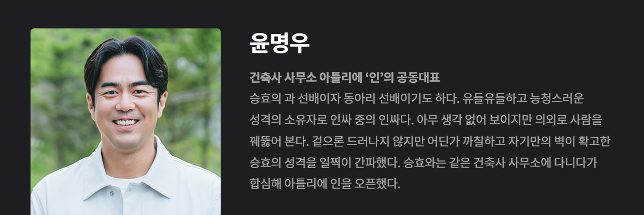 윤명우는 최승효와 함께 건축 사무소 아틀리에 '인'을 공동으로 운영하는 파트너이자, 승효의 과거 동아리 선배입니다. 그는 승효의 건축가로서의 성장을 가까이에서 지켜보며 조언을 아끼지 않는 든든한 조력자입니다. 윤명우는 가정에서도 쌍둥이 아빠로서, 시험관 시술을 통해 어렵게 얻은 아이들을 키우느라 늘 피곤한 상태지만, 일에서는 철두철미한 태도를 유지합니다. 그는 승효와의 파트너십을 통해 건축 사무소를 성공적으로 이끌어 나가며, 때로는 그의 개인적인 고민을 들어주는 역할도 합니다. 윤명우는 드라마 속에서 승효에게 가장 가까운 어른이자 친구로, 그의 심리적 안정감을 지탱해 주는 중요한 인물입니다.