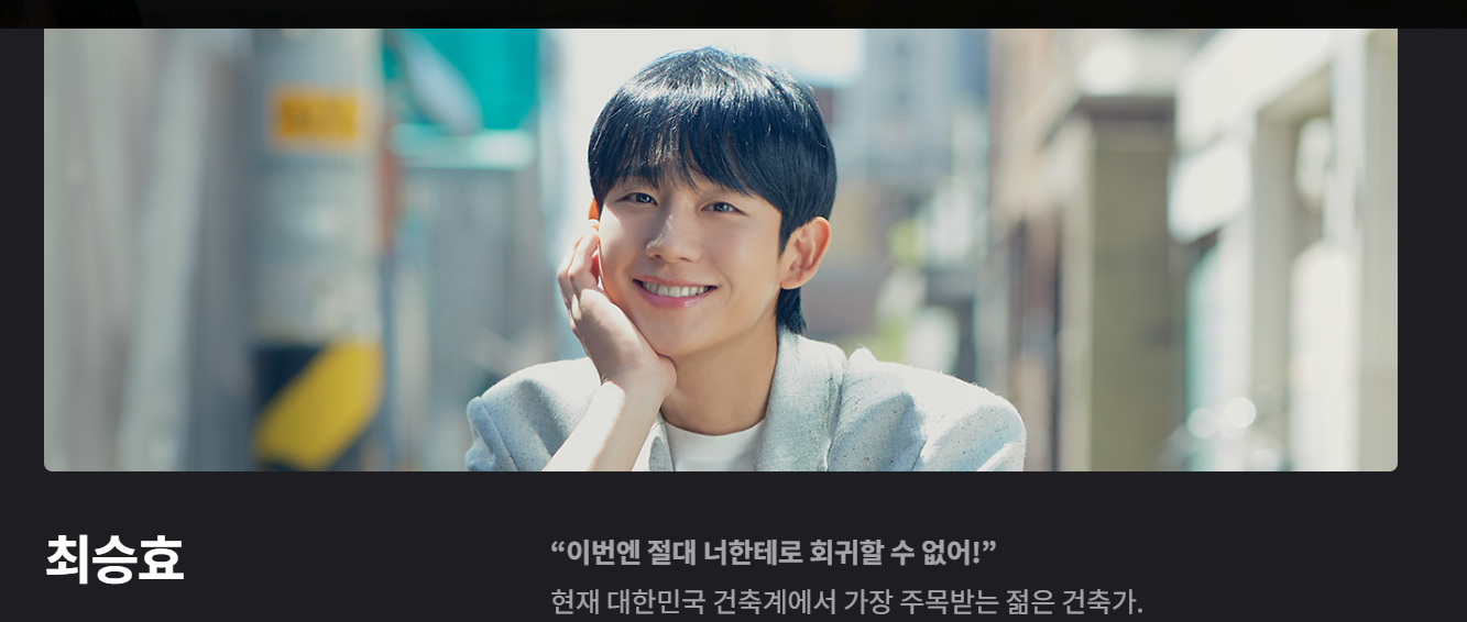 | 최승효 | 정해인 | 건축 사무소 아틀리에 '인'의 대표이자 완벽한 엄친아 |