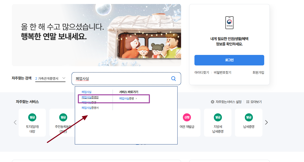 ③ 로그인 후 메인 화면의 검색창에 "폐업사실증명"을 입력하고 검색합니다.