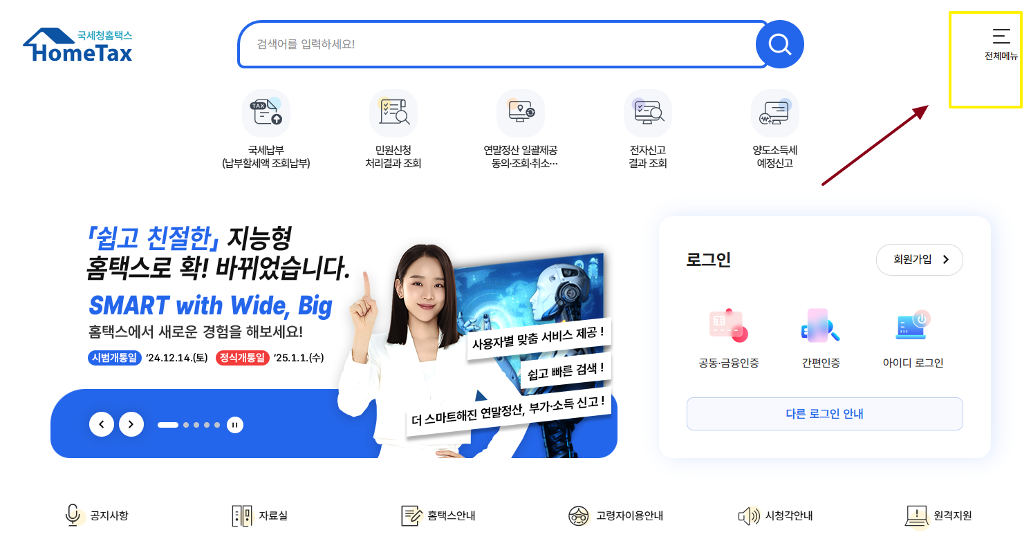 ② 상단 메뉴에서 "로그인" 버튼을 클릭하고 공동인증서, 금융 인증서, 또는 간편 인증을 통해 로그인합니다.